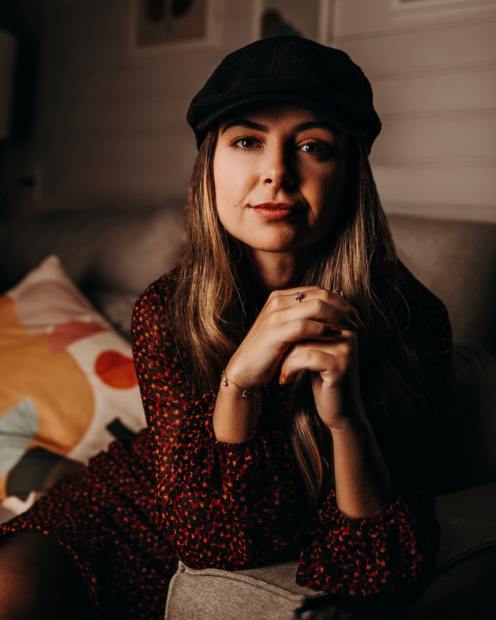 A serene woman smiling softly in pastel tones, embodying calm confidence.